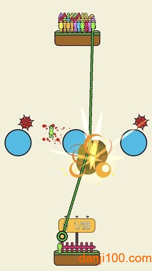 绳索可以在蓝色的支撑物上自由绕行,玩家需要利用这一特性设计最佳路线。游戏包含数十个特色关卡,每个关卡都有独特的场景设计和挑战内容。危险的障碍物分布在不同位置,玩家必须让孩子们避开这些致命威胁;