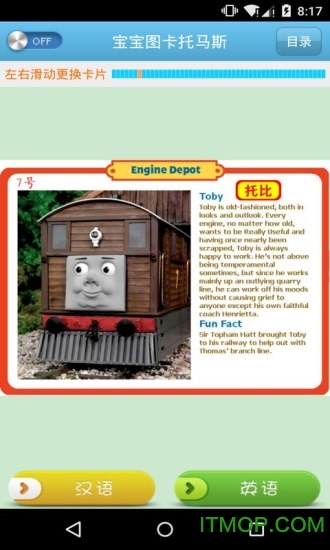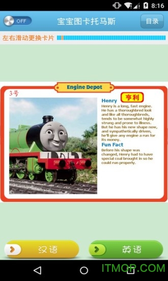 宝宝图卡托马斯是一款专为1-6岁婴幼儿设计的双语早教应用,以经典动画角色托马斯和他的朋友们为主题。这款APP通过生动有趣的动画图卡形式,帮助宝宝在快乐观看的同时学习基础英语。应用采用中英文双语标注,配有标准语音朗读,让宝宝在语言敏感期轻松接触双语环境。鲜艳的色彩搭配和护眼背景设计,既吸引宝宝注意力又保护视力发育。通过托马斯和朋友们的趣味故事,宝宝不仅能认识交通工具,还能学习友爱互助、乐观开朗等优秀品质,是寓教于乐的优质早教选择。