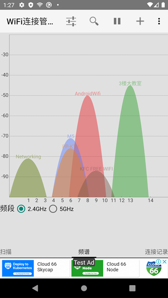 显示频谱图,方便查看网络拥挤情况。直观展示周边WiFi信道占用情况,帮助选择最佳信道避免干扰。