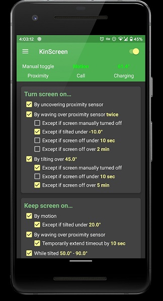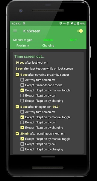 KinScreen是一款专为长时间使用手机或在复杂光线环境下工作的用户设计的智能屏幕管理工具。它能根据用户的使用习惯自动调节屏幕亮度和超时设置,提供更舒适的视觉体验和更高效的操作环境。无论是工作还是娱乐,KinScreen都能通过智能化的屏幕管理功能,减少眼睛疲劳并优化手机使用体验。其便捷的手势控制和个性化设置让用户能够轻松掌控屏幕状态,让手机使用变得更加智能和人性化。