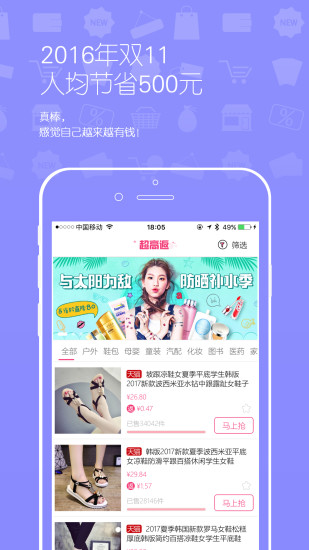 品牌保障:精选知名品牌商品,涵盖服装、美妆、居家、母婴、食品、鞋包、数码电器等全品类,让用户实现少花钱多生钱;