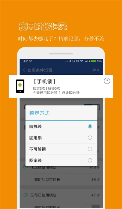 3.专业:APP多重锁定机制,为用户精确记录时间流逝,使用记录一目了然。研发团队包含行为心理学专家,锁定策略基于"渐进式戒断"理论设计,避免突然严格管控带来的反弹效应。