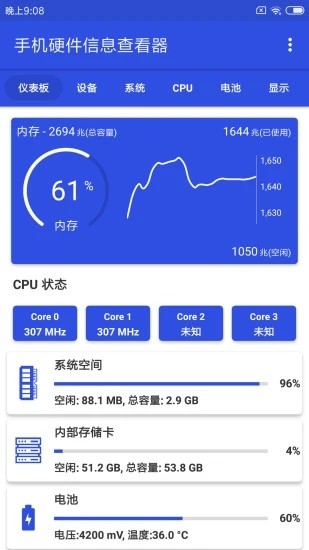 查看手机内存容量、内存带宽、内存通道,内存容量大小。新增内存使用历史记录功能,可查看内存占用趋势图。