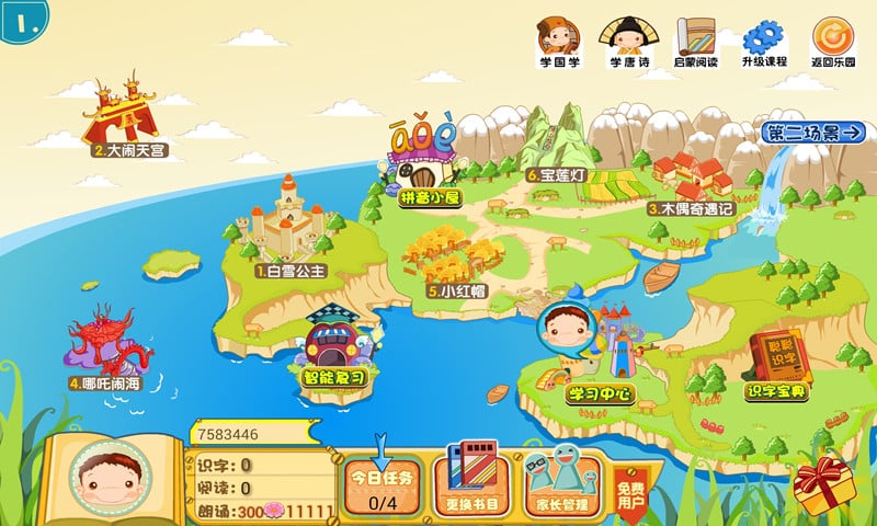 4、软件设置了四大主题场景,包含24个经典儿童故事作为学习背景,并配套360个与故事情节相关的互动识字游戏,构建了完整的沉浸式学习环境,全面提升孩子的学习效果。