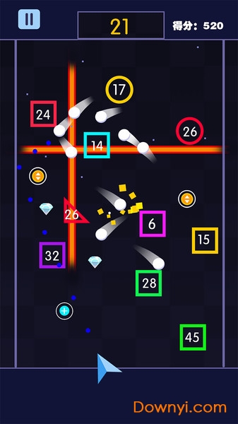 游戏中的数字方块会不断从顶部下落,玩家需要利用弹珠的反弹特性,以最佳角度消除这些方块;