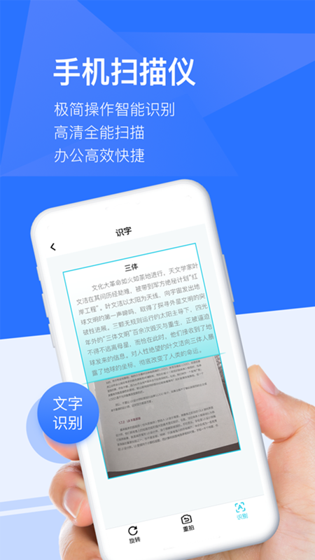 2.只需拍一张照片就能快速识别,一键扫描文本并进行编辑。智能OCR技术可识别多国语言,支持中英文混合识别。