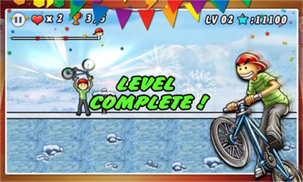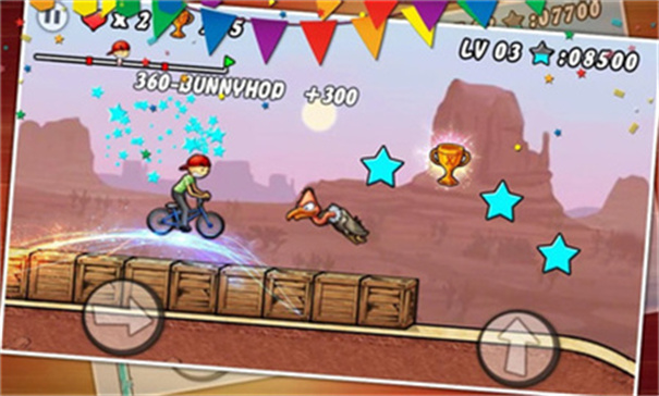 游戏突破传统跑酷模式,将自行车特技与节奏玩法完美融合,玩家可施展后轮滑行、空中转体等20余种专业动作。每个场景都设有隐藏捷径,比如森林关的树藤摆荡通道能节省30%路程。