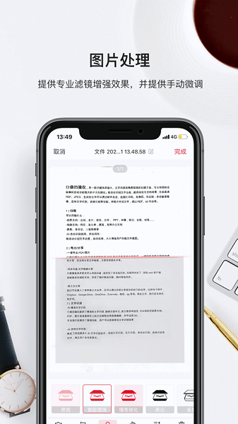 【滤镜】内置多种专业图像处理模式,包括增强锐化、黑白、灰度和省墨等,可根据不同文档类型智能推荐最佳处理方案。特别设计的"发票模式"能自动突出红色印章,"书籍模式"则可消除装订线阴影。