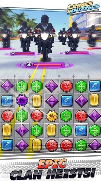 犯罪与谜题中文版是一款将经典三消玩法与犯罪题材完美结合的策略休闲游戏。在这个充满街头帮派斗争的世界里,玩家需要通过消除不同颜色的宝石来发动攻击、驾驶车辆或执行特殊任务。游戏巧妙地将紧张刺激的帮派火拼、高速追逐等电影级场面融入轻松的三消机制中,让玩家在休闲娱乐的同时体验黑帮传奇。每颗宝石都对应独特的行动效果,合理的消除策略将成为制胜关键。精致的画面表现和丰富的剧情设定,为传统三消游戏注入了全新的活力。