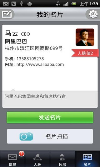 2.在手机上建立自己的名片和名片夹,无限量名片存储空间。应用采用云端存储技术,不仅容量无上限,还能自动备份,防止数据丢失。用户可以自定义名片模板,打造个性化的电子名片。