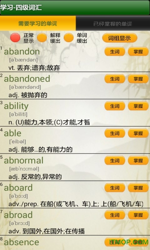 1.提供一览学习模式,逐词学习模式,复习模块和测试模块等多种学习模式,满足不同学习习惯的用户需求。