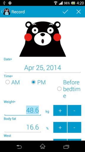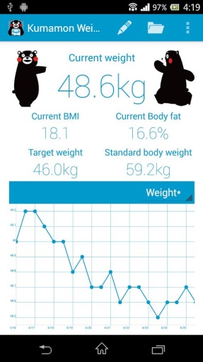 熊本熊体重记录KumamonWeight是一款集趣味性与实用性于一体的健康管理软件。它以可爱的熊本熊为形象大使,让枯燥的体重记录变得生动有趣。软件采用科学算法,通过早晚两次体重记录建立完整的健康档案,帮助用户准确掌握身体变化趋势。特别设计的饮食建议系统会根据您的体重数据提供专业的营养搭配方案,让健康管理更加系统化。无论是安卓还是iOS用户,都能享受到这款app带来的便捷体验。