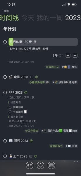 待办和标签是3x3软件的核心功能模块,它们与时间线的联动创造了无限可能。用户可以在今日和标签页通过+号创建待办事项,在周/年视图则可以制定更长期的计划。特别值得一提的是年度视图中的"一生待办"功能,让用户可以记录人生目标。新建待办时支持关联其他事件或标签,还可以设置进度条或子任务。建议用户在设置界面的标签管理中统一创建标签,这样能保持标签系统的条理性。子标签的创建需要先建立父标签再进行移动操作,合理的标签体系能大幅提升使用体验。