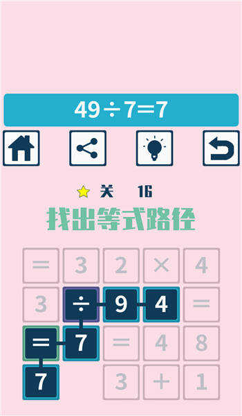 1、直观的触控操作,只需点击屏幕中的数字和符号就能组合等式,误操作时可一键撤销,保证游戏流畅性;2、贴心的界面设计,提供快捷返回主页按钮,让玩家能随时暂停游戏处理其他事务;3、智能存档系统自动记录通关进度,方便玩家随时查看已通过的关卡数和当前挑战进度;4、人性化的提示功能,遇到困难时可获取通关线索,既保持挑战性又避免过度卡关;5、便捷的社交分享,一键将有趣关卡分享给好友,共同探讨解题方法;6、清晰的进度标识,每完成一关都会明确显示,激励玩家继续挑战下一关卡。