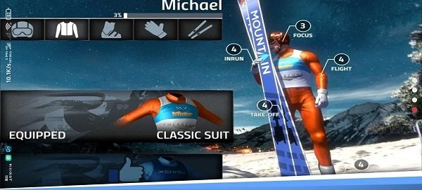 角色成长体系包含12项可升级属性,从平衡力到空中调整速度都能深度定制。每套滑雪装备都有独特的物理参数,碳纤维雪板更适合高速滑行,而钛合金框架则擅长吸收冲击;