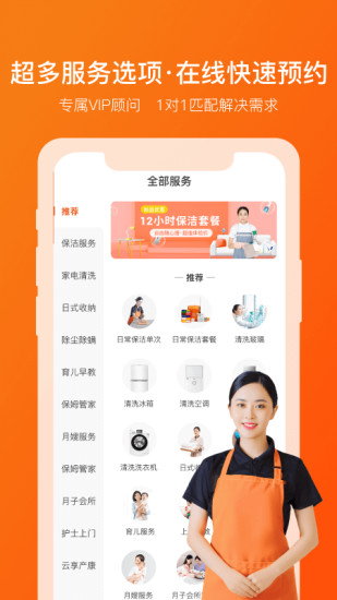 丰富服务,自由选择,软件中拥有超级丰富的各种服务内容,让用户可以轻松的来进行所有内容的传递和预约,预约月嫂以及产后康复和保洁。平台特别推出季节性特色服务,如春节大扫除、空调清洗等时令项目,满足用户不同时段的特殊需求。每种服务都明码标价,支持按小时或包月等多种计费方式,让消费更加透明合理。