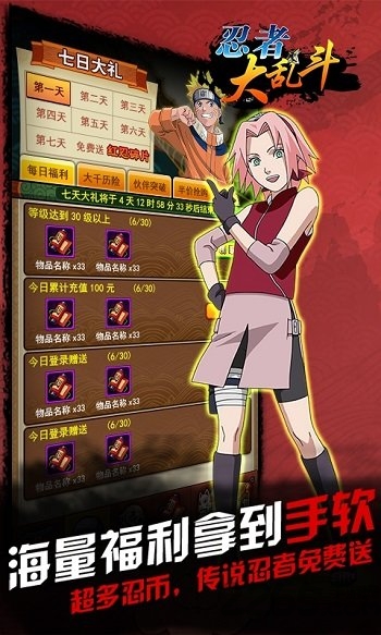 2、新玩家上线即可领取VIP5特权礼包,包含8888忍币和50万金币的丰厚奖励。