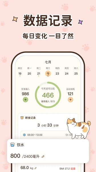 数据记录,每日变化都是一目了然,实时详细进行记录;系统会自动记录用户的体重、体脂率、运动量等关键数据,并生成详细的日报和周报,帮助用户清晰掌握自己的进步轨迹。