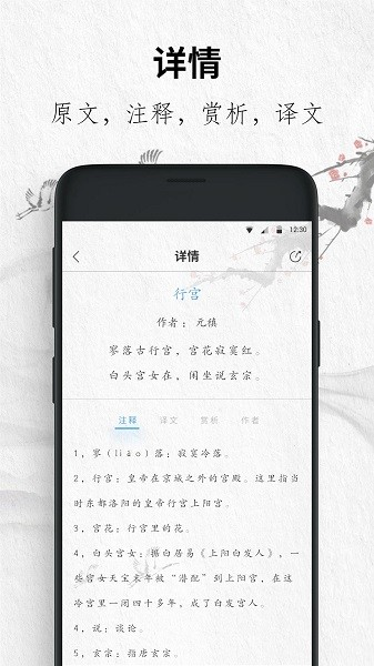 点击进入诗文,查看诗文原文、注释、译文、赏析、作者等。左右滑动可切换上一首/下一首。