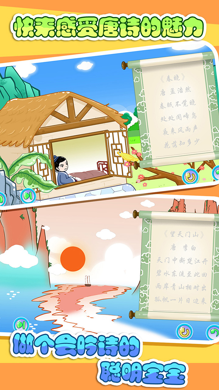 【背景动画】精心设计的动态场景与诗词意境完美契合,通过视觉刺激加深孩子对诗词的理解和记忆。【返回功能】人性化的操作界面设计,支持一键返回上一首或主页,方便孩子自主操作。【语音播放】专业播音员录制的标准普通话朗读,语速适中,发音标准,帮助孩子掌握正确读音。【暂停模式】灵活的播放控制功能,可以随时暂停或继续播放,方便孩子跟读学习。【背景解读】每首诗词都配有通俗易懂的解读说明,用孩子能理解的语言解释诗词背景和含义。