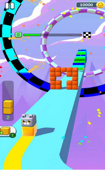 1、玩家需要精准控制方块人的移动,在复杂的赛道上灵活穿梭,克服重重障碍向前冲刺。