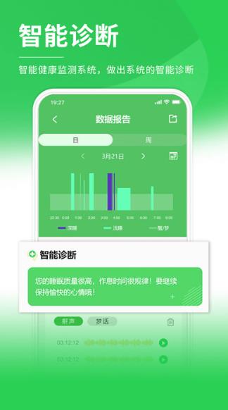 1,根据用户的睡眠曲线或者鼾声梦话,形成睡眠报告,通过报告,进行合理的计划,打造一个好的身体,睡眠曲线是指几时进入浅睡眠,几时进入深睡眠。系统会记录用户整晚的睡眠周期变化,精确分析每个阶段的持续时间,并结合心率、体动等数据,给出个性化的睡眠质量评估。用户可以通过这些数据了解自己的睡眠模式,发现潜在问题,并根据app提供的专业建议进行调整。