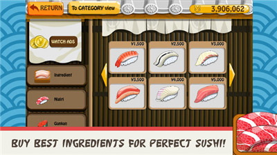 游戏场景采用精美的日式风格设计,从木质吧台到悬挂的灯笼,每个细节都让玩家仿佛置身于东京街头的寿司小店。玩家不仅需要关注店铺装修升级,还要通过招聘专业服务员、优化用餐环境来提升顾客满意度。在寿司制作环节,游戏提供了数十种新鲜食材和多种烹饪技法,玩家需根据顾客的个性化需求精准搭配,从醋饭的酸度到鱼生的厚度都需精心把控。随着店铺等级提升,玩家还能解锁高级食材和特殊厨具,为顾客带来米其林级别的用餐体验。