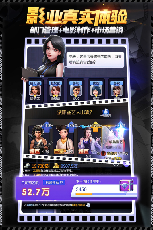 1、电影拍摄:作为游戏的核心玩法,玩家需要全方位把控电影制作流程。从挑选契合艺人特质的剧本开始,到确定影片类型、场景搭建、档期安排等每个环节都需要精心策划。不同类型的电影会带来差异化的市场反响,玩家既要考虑商业价值,也要兼顾艺术追求,在票房与口碑间寻找完美平衡。