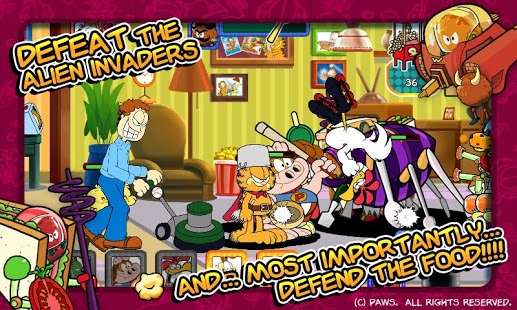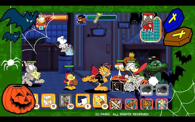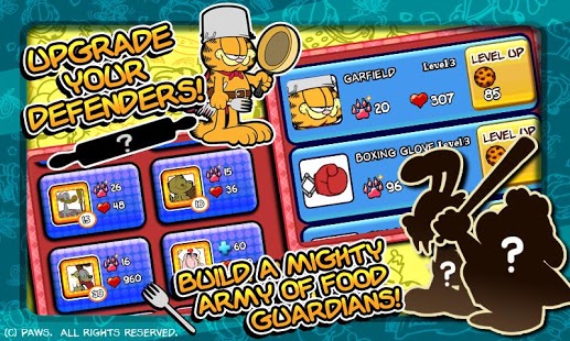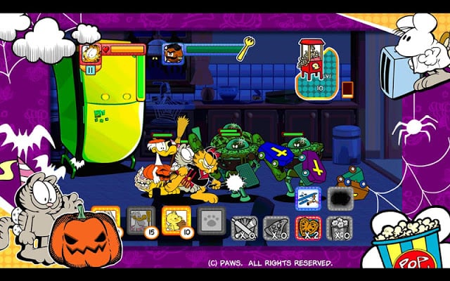 1、您要控制加菲猫,他的储藏库有着各种各样的武器;游戏中的武器系统会随着关卡推进逐步解锁,初始只有基础餐具,后期可获得激光披萨发射器等科幻装备。每种武器都有独特的升级树,玩家可以根据战斗风格自由搭配。
