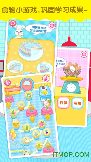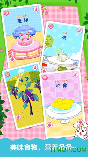 新增多个食物内容,通过丰富的图片和背景,图文并茂的展示食物的各个内容。新增食物生长过程动画,让宝宝了解食物从种植到餐桌的全过程。增加季节性食物专题,帮助宝宝认识时令食材。