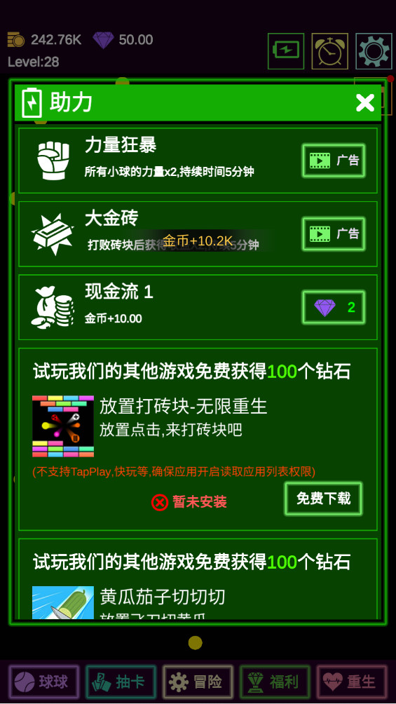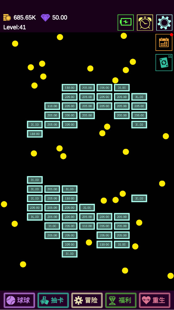 4.游戏内置了丰富的卡牌收集系统,每完成一个关卡都能获得抽卡机会。这些卡牌可以永久强化弹球属性,比如增加攻击力、附加穿透效果或改变弹射角度。玩家需要根据当前关卡特点,选择最适合的卡牌组合进行装备。