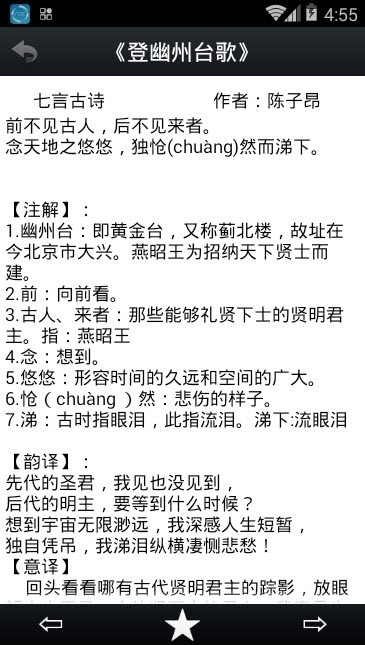 应用采用人性化的知识管理设计,收藏夹支持多级分类和自定义标签,用户可建立"山水田园""边塞战争"等个性化诗集。智能搜索功能突破传统检索限制,支持通过意象(如"明月""杨柳")和修辞手法进行内容挖掘。详尽的注释系统包含历代名家点评、典故出处和格律分析,用户添加的私人备注会自动同步至云端,并可通过主页图标快速识别已备注内容,实现学习进度的可视化追踪。