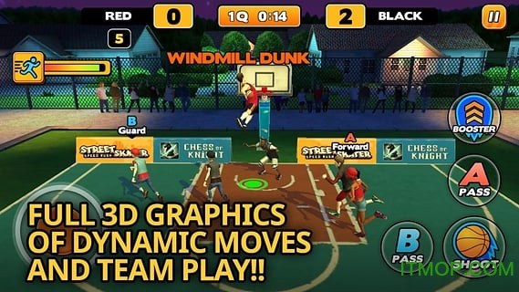 街头灌篮中文破解版(StreetDunk3on3Basketball)是一款充满街头风格的3V3篮球竞技手游。游戏以简洁的操作和快节奏的对抗为核心,让玩家随时随地都能体验热血沸腾的街头篮球对决。独特的慢动作灌篮特效、流畅的比赛节奏和简单易上手的操作方式,让这款体积小巧的游戏拥有不输大作的游戏体验。无论是想重温街头篮球的激情,还是寻找一款休闲竞技手游,这款游戏都能满足你的需求。游戏采用虚拟摇杆搭配功能按键的操作模式,完美还原了篮球运动中的各种基础动作,让你在方寸屏幕间也能感受到篮球运动的魅力。