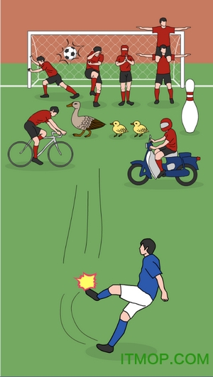 这款游戏完全颠覆了传统足球游戏的写实风格,采用夸张搞笑的卡通画风。游戏中完全不需要考虑专业足球游戏中的力度控制、触球点等复杂参数,一切以娱乐效果为主。玩法设计极其简单:点住屏幕拖动选择方向,松开手指完成射门。最有趣的是防守人墙的表现,他们会用各种脑洞大开的卖萌方式来阻挡射门,比如变身成各种奇怪造型、使用离谱的道具等。这款轻松幽默的小游戏一定能给玩家带来欢乐的休闲时光。