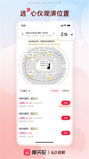 A:摩天轮票务为部分演出提供在线选座功能,用户点击"选座购买"即可进入可视化选座界面,直观选择心仪座位。对于不支持在线选座的场次,平台会根据用户选择的票面区域自动分配最佳座位。无论哪种方式,平台都致力于为用户提供最佳的观演体验。