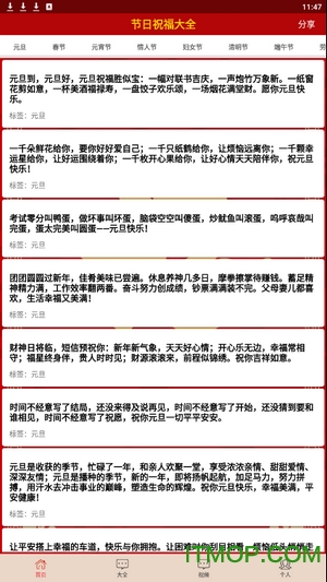 2020节日祝福大全app是一款专为节日问候打造的实用手机应用,汇集了海量精选祝福语资源。软件按照春节、元宵节、中秋节等二十多个中外节日进行分类,同时还细分为生日祝福、结婚祝福等场景,以及同事、领导、爱人等不同接收对象。所有祝福语都支持一键复制功能,让您能轻松通过微信、短信等社交平台分享祝福。无论是传统佳节还是现代节日,这款app都能为您提供最贴心的祝福语解决方案。