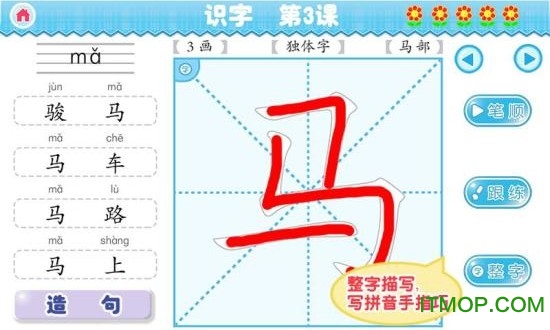 我爱写字(1上)北师大版是一款专为小学低年级学生设计的汉字学习软件,采用北师大版教材同步内容,通过趣味互动方式培养孩子的书写兴趣。软件包含"我爱学习"、"我要挑战"等核心模块,以生动可爱的卡通界面吸引孩子注意力,结合笔顺检查、组词造句等功能,帮助孩子掌握规范书写技巧。系统采用循序渐进的学习模式,每课内容都配有动画演示和发音指导,让孩子在轻松愉快的氛围中提升识字能力和书写水平,是家长辅导孩子学习汉字的得力助手。