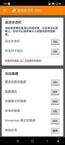 5、自动隐藏之排除应用:智能的应用程序排除功能,可以指定在某些特定应用(如相机、游戏等)中自动隐藏迷你状态栏。这样既保证了日常使用的便利性,又不会影响特定应用的全屏体验,真正做到智能显示。