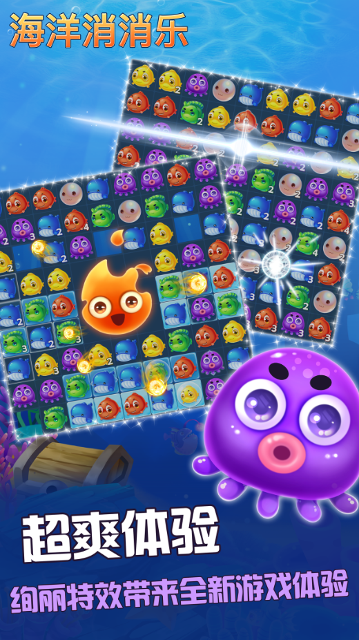 1、经典的消除规则:游戏在传统三消玩法基础上进行了创新改良,除了基础的横向纵向消除,还加入了特殊的"L型"和"T型"消除奖励机制。当玩家连续达成多次消除时,会触发华丽的连锁反应特效,各种小鱼会以炫目的方式炸开,带来视觉和听觉的双重享受。