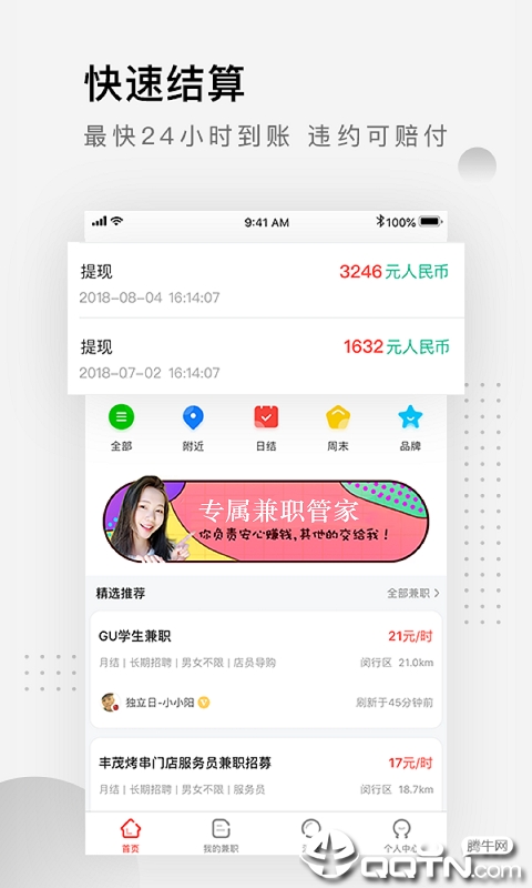【快速结算】平台建立专门的财务跟踪系统,专人负责监督兼职工资发放情况。大部分兼职工作都能在完成后的3个工作日内结算,部分线上任务更可实现即时到账,让用户的劳动成果得到及时回报。