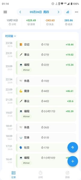 收入关联-独特的收入计算系统,用户可设置预期收入目标,系统会根据记录的活动类型自动计算时间价值,让时间管理更具现实意义。