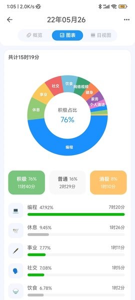 统计分析-提供多维度的数据统计功能,可按日/周/月/年等不同时间维度查看时间分配情况,通过饼图、折线图等可视化图表直观展示时间去向。