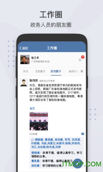 为政府部门打造的组织文化建设平台,支持政务人员分享工作成果、交流经验心得。通过工作圈,领导和普通工作人员可以打破层级限制,进行互动交流,增强组织凝聚力。该功能有助于营造积极向上的工作氛围,激发政务团队的创新活力。