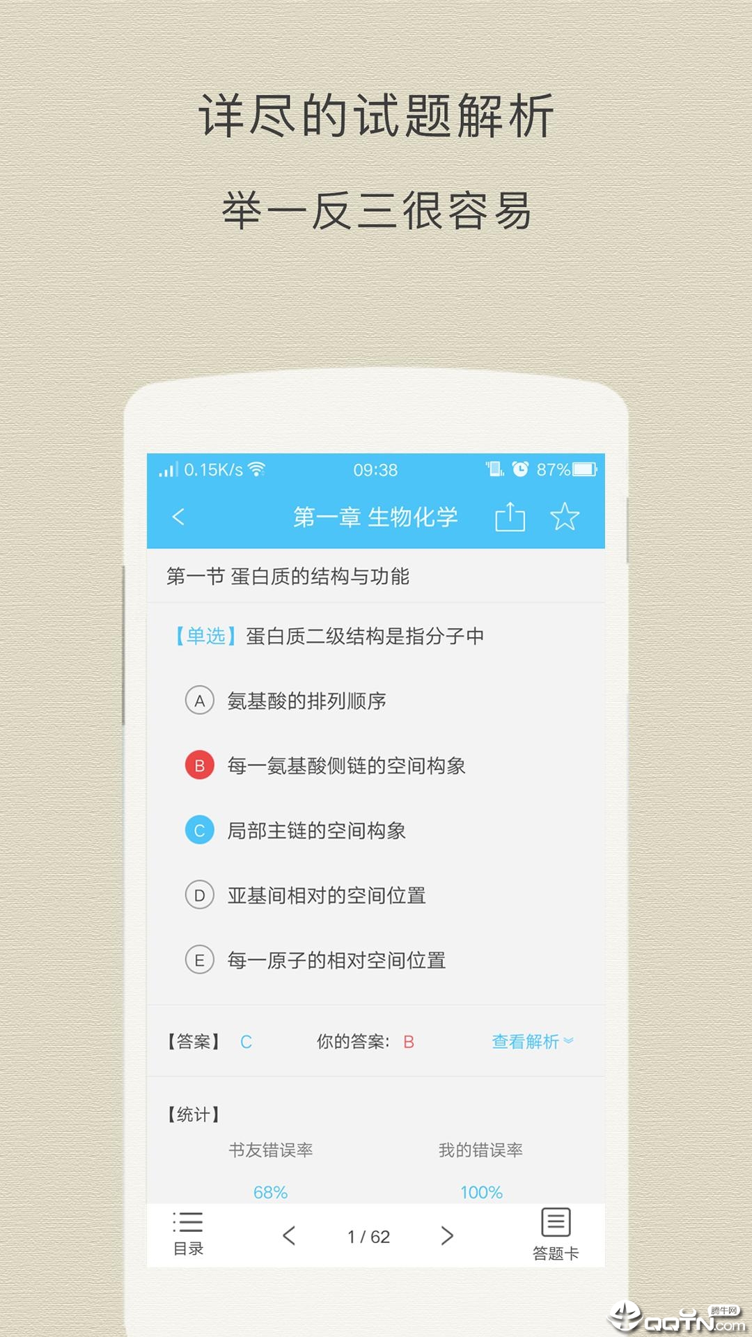 3.题型加强:针对A1、A2、A3/A4、B1等不同题型设置专项训练。系统会根据用户薄弱环节智能推送相关题型练习,通过大量同类型题目训练,快速提升解题技巧和应试能力,有效避免考试时的题型不适应问题。