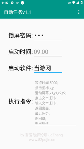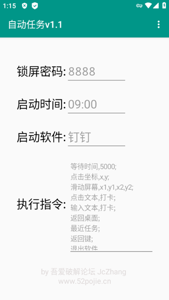 这个功能允许用户设置特定的时间点,当到达设定时间时,软件会自动解锁手机并执行预设指令。如果将时间参数设置为666,则表示每次启动软件后10秒自动执行指令,这个设计非常灵活,可以满足不同场景的需求。