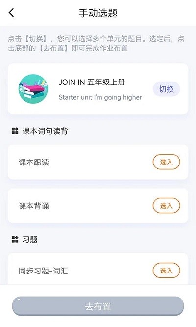 【布置作业】:提供丰富的作业类型选择,包括课本配套练习、单词听写、单元测试等,内容与教材同步更新,支持个性化作业设置。