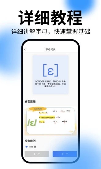 2、系统教授法语基础知识,包含完整的法语字母发音表,详细讲解元音、辅音的标准发音要领;