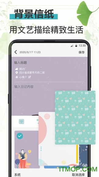 「精美信纸」系统自带多种风格的信纸模板,同时支持自定义信纸,让您的日记更具个性化。