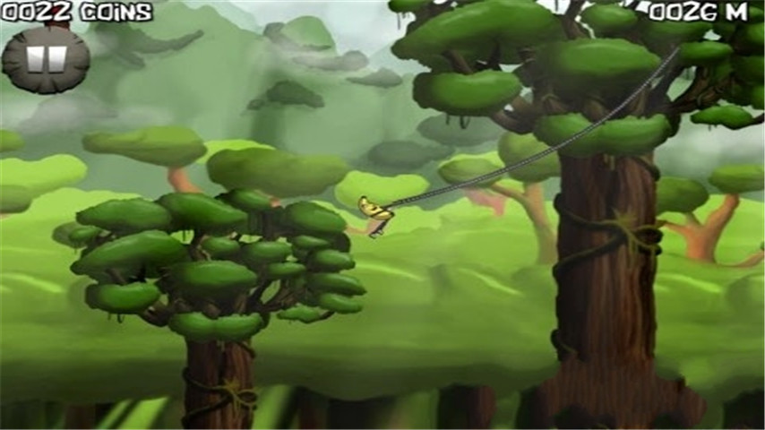 游戏中玩家要利用绳子操控主人公穿梭在树木间,不能让他掉下来。玩家需要掌握精准的时机判断,在角色即将到达摆动最高点时松开绳索,以获得最大的前冲力。游戏中的每个物体都有不同的物理特性,比如树木的摆动幅度较小但稳定性高,而飞石虽然能提供更大的推力但持续时间较短。