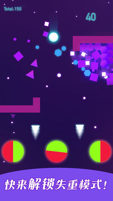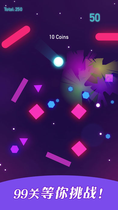 玩家通过点击屏幕来控制白色小球的跳跃移动,在躲避下落色块的同时,利用反弹机制来通关。游戏中设置了多种颜色的色块,每种颜色都对应不同的效果:紫色色块可以提升移动速度,橙色和绿色色块碰撞后能获得额外金币奖励。特别值得一提的是,绿色障碍色块虽然需要避开,但成功穿越后也能获得金币。游戏操作简单直观,但想要获得高分需要熟练掌握各种色块的特性和反弹技巧。